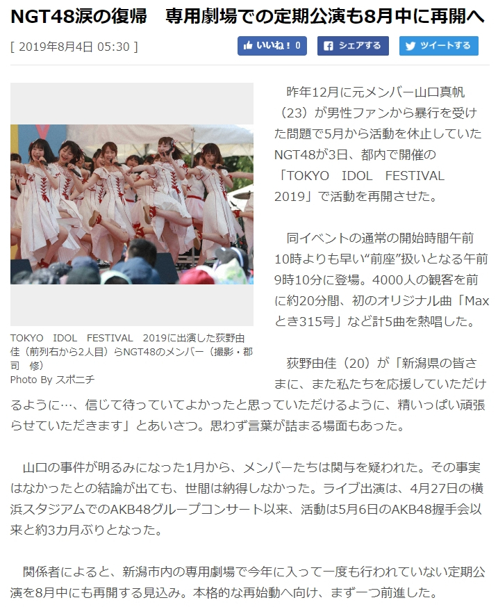 山口の事件が明るみになった1月から、メンバーたちは関与を疑われた。その事実はなかったとの結論が出ても、世間は納得しなかった。ライブ出演は、4月27日の横浜スタジアムでのAKB48グループコンサート以来、活動は5月6日のAKB48握手会以来と約3カ月ぶりとなった。