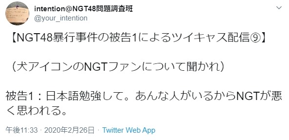 被告1:日本語勉強して。あんな人がいるからNGTが悪く思われる。
