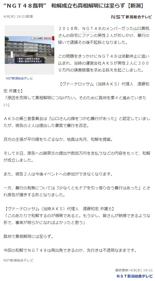 和解条項として、数百万円が支払われること、被告2人の連名による謝罪文が提出されたこと、さらに、NGT48の他メンバーが山口への暴行事件に関与していないことを原告側が認めたことなどを挙げた。